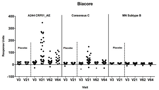 No anti-V1V2 reactivity was detected among placebo recipients to any of the subtypes tested (data not shown).