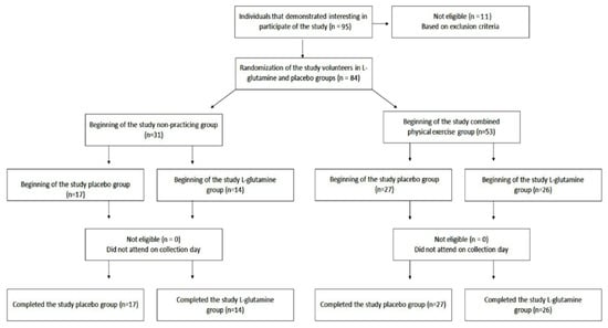 The groups supplemented with l-glutamine ingested 0.3 g/kg of weight/day of l-glutamine (Tongliao Meihua Biological Sci Tech Co. Ltd., Tongliao, China) added with 10 g/day of maltodextrin (PR Netto Indústria e Comércio de Alimentos Ltd.a., Sao Paulo, Brazil). It is worthy to clarify that the dose of L-glutamine used here followed that described in the study of Legault et al. [12,13]. The subgroups supplemented with placebo ingested only 10 g/day of maltodextrin. All the volunteers were oriented to dilute 1 sachet of the supplement (L-glutamine or placebo) in 250 mL of water and ingest the solution immediately, for 30 consecutive days. In addition, all the participants were oriented to interrupt immediately the ingestion of any type of supplementation if any gastrointestinal disturbance was perceived.