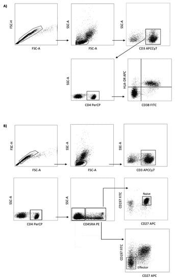 Flow cytometer analysis of cellular activation, CD4+ T cells naive and effector memory. Representative dot plots of a flow cytometry panel used for the detection of CD4+ T cells activated (A) and CD4+ T cells naive and effector (B). PBMCs were stained with Abs recognizing CD3, CD4, CD8, HLADR, CD38, CD45RA, CD27, and CD197 and were analyzed by flow cytometry, gating as indicated.