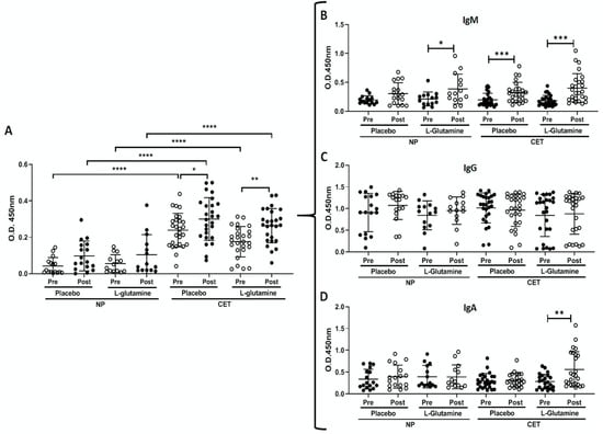 Total concentration of polyclonal antibodies (A) [IgA (B), IgM (C) and IgG (D)] specific for influenza vaccine in the groups of elderly non-practitioners (NP) and practitioners of combined-exercise training (CET), supplemented with L-glutamine or placebo. The concentrations were determined in serum samples obtained before (Pre) and after 30 days (Post) of vaccination and supplementation. Significance level of * p < 0.05, ** p < 0.01, *** p < 0.001, **** p < 0.0001.
