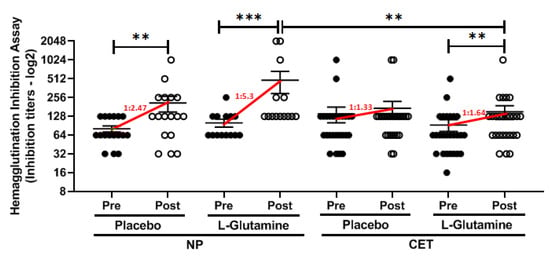 Hemagglutination inhibition (HI) assay antibody titers (log2) against the H1N1 virus in the groups of elderly non-practitioners (NP) and practitioners of combined-exercise training (CET), supplemented with L-glutamine or placebo. The antibody titers were determined in serum samples obtained before (Pre) and after 30 days (Post) of vaccination and supplementation. Red lines indicate the antibody titer increase rate. Significance level of ** p < 0.01, *** p < 0.001.