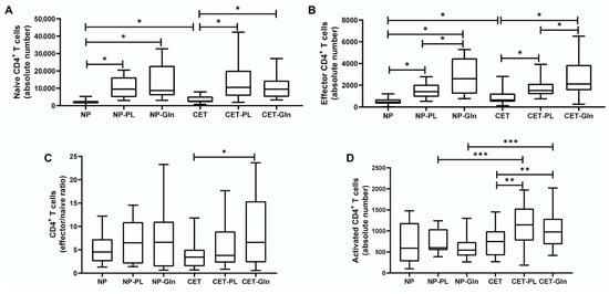 3.3. l-Glutamine Supplementation Increases the Absolute Number of Effector CD4+ T Cells, Whereas the CET Increase the Activated CD4+ T Cells
