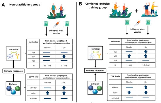 Although it has clear that Gln present functional properties, especially in the immune and musculoskeletal systems, the effects of Gln supplementation in the specific immune response against the Influenza virus vaccine in a population of exercised elderly individuals has never been evaluated. Therefore, in this study, we investigated the specific antibodies levels (IgA, IgM, and IgG) in response to Influenza virus vaccination, as well as the number and activation of T CD4+ cells (both naive and effector) in elderly people, participated or not of a regular program of combined-exercise training, and supplemented or not with Gln.
