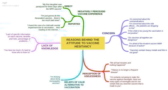 In order to explore the reasons for the attitude towards vaccine hesitancy, the answers to the open-ended question on this topic were analysed, merging similar contents into the same category. The results were illustrated through a mental map, with a textual explanatory quotation for each identified category.