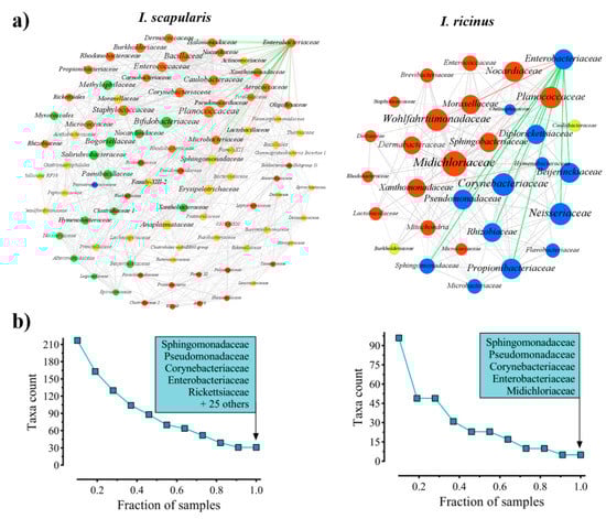 Interactions and ubiquitous bacterial families on the gut microbiota of I. scapularis and I. ricinus nymphs. (a) Co-occurrence bacterial networks obtained from 16S sequences. Nodes correspond to taxa (family level), and connecting edges indicate significant (p < 0.01) and strong positive or negative correlations (SparCC > 0.7 or < −0.7). Only nodes with at least one significant correlation are represented. Node colors are based on modularity class metric, hence the same color mean modules of co-occurring taxa. The size of the nodes is proportional to the eigencentrality of each taxon. Enterobacteriaceae is highlighted (top right), and the connecting edges differentiated in positive (green) and negatives (red). (b) Identification of the ubiquitous families across the samples in each data set. Four families were found in all samples (n = 20) from both I. scapularis and I. ricinus nymphs.