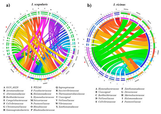 Metagenome contribution to α1,3-galactosyltransferase genes in the gut microbiota of (a) I. scapularis, and (b) I. ricinus nymphs. The position of Enterobacteriaceae was highlighted (red *). KEGG orthology and taxonomic contribution was predicted using PICRUSt2. Chord diagrams show the linkage between classified and unclassified (unassigned) taxa and α1,3-galactosyltransferase genes. The arcs indicate connections, represented proportionally by the size of each arc. Node segments along a circle represent taxa or functional genes, the node size indicates the abundance (measured as feature count) of contributing taxa and genes. Chord diagrams were made with the visualization tool “Circos” [37].