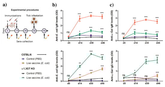 Antibody response of C57BL/6 and α1,3GT KO mice after immunization with a live E. coli vaccine. (a) Mice were immunized twice and then infested with I. ricinus nymphs. The levels of IgM and IgG to E. coli proteins (b) and α-Gal (c) were quantified in sera by ELISA. Results shown are means and standard error values. Results were compared by two-way ANOVA with Bonferroni test applied for comparisons between control and immunized mice within each strain C57BL/6 or α1,3GT KO (* p < 0.05, ** p < 0.001, *** p < 0.0001, ns—not significant; 1 experiment for each mice strain, n = 10 α1,3GT KO mice, n = 10 C57BL/6 mice and three technical replicates per sample).