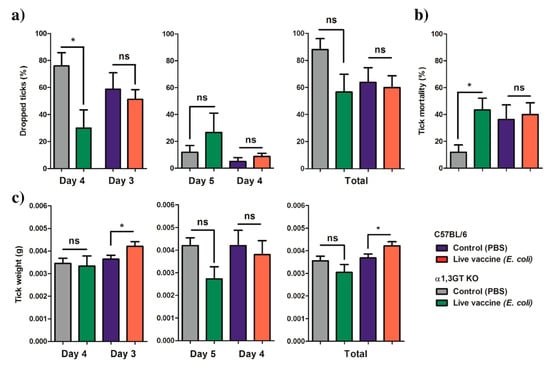 Performance of I. ricinus nymphs feeding on α1,3GT KO and C57BL/6 mice immunized with live E. coli. (a) The percentage of ticks that dropped on day 3, 4 or 5, and the total, was calculated and compared between groups. (b) The percentage of dead ticks was calculated and tick mortality (%) compared between groups. (c) At the end of feeding, the weight of individual ticks was measured and compared between groups. Means and standard deviation values are displayed. Results were compared within each mouse strain by Mann−Whitney U test. (* p < 0.05, ns—not significant; 1 experiment for each mouse strain, n = 12 α1,3GT KO mice (n = 5 ticks per mouse), n = 10 C57BL/6 mice (n = 20 ticks per mouse)).