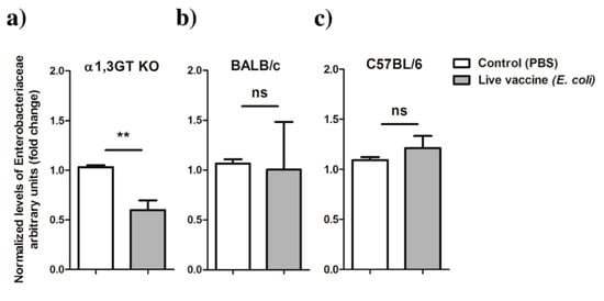 Relative abundance of Enterobacteriaceae in I. ricinus microbiota after feeding on E. coli-immunized mice. The relative abundance of Enterobacteriaceae was measured in adult ticks that in the previous stage (i.e., nymphs) had fed on (a) α1,3GT KO or (b) BALB/c and in engorged nymphs that fed on (c) C57BL/6 mice. Relative bacterial DNA levels were measured using Enterobacteriaceae-specific 16S qPCR normalizing against tick rsp4 with the 2−ΔΔCt ratio method. Results are relative to 16S in the control group. Means and standard deviation values are displayed. Results were compared within each mouse strain by Mann−Whitney U test. (** p < 0.001, ns—not significant; n = 11 pools of ticks that fed α1,3GT KO mice, n = 9 pools of ticks that fed BALB/c, n = 18 pools of ticks that fed C57BL/6 mice).