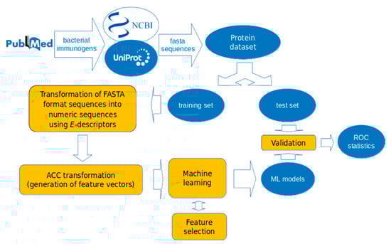 Workflow of machine learning (ML) models development in the present study. The dataset of 317 bacterial immunogens and 317 bacterial non-immunogens was divided into training and test sets. The training set was used for model development, and the test set for validation. The proteins were encoded by E-descriptors and auto-cross covariance (ACC)-transformed into uniform vectors. The models were validated by receiver operating characteristic (ROC) statistics.