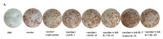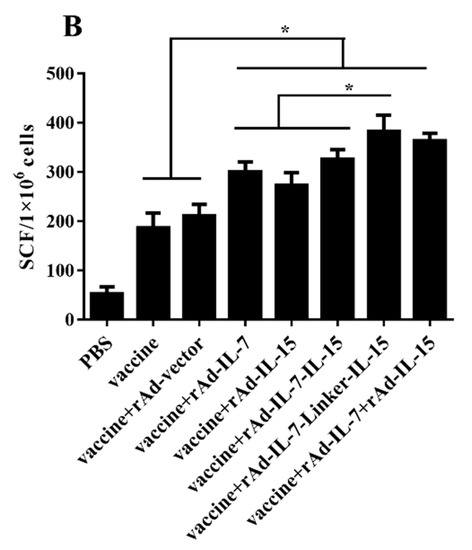 Mice were divided into eight groups: The non-vaccinated mice received PBS; The vaccinated mice were topically immunized with vaccine, either co-administration of rAd-vector, rAd-IL-7, rAd-IL-15, rAd-IL-7-IL-15, rAd-IL-7-Linker-IL-15 or rAd-IL-7 + rAd-IL-15, respectively. For the group of PBS, mice were inoculated with PBS in a total volume of 200 μL/dose subcutaneously once at 0 week. For the other groups, vaccinations were performed at weeks 0, 2 and 4, respectively. Mice were immunized by the vaccine subcutaneously in a total volume of 200 μL/dose/mice on one side of the groin. At 30 min after protein vaccine immunization, 5 × 106 PFU/100 μL/mice of rAd-vector, rAd-IL-7, rAd-IL-15, rAd-IL-7-IL-15, rAd-IL-7-Linker-IL-15, or rAd-IL-7 + rAd-IL-15, respectively were injected at the same site.