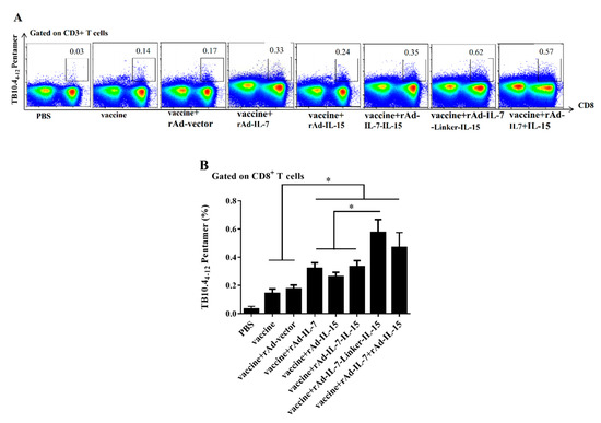 Number of expanded TB10.4-specific CD8+ T cells in spleens. Mice were injected with BCG by i.p. at 20 weeks after the final immunization. After 9 days, the number of TB10.4-specific CD8+ TCM like cells was evaluated by TB10.44-12 pentamer. (A) The representative results of every group; (B) Frequency percentages of TB10.4-specific CD8+ TCM like cells. Data collected were presented as means ± SD from 5 mice per group. * p < 0.05.