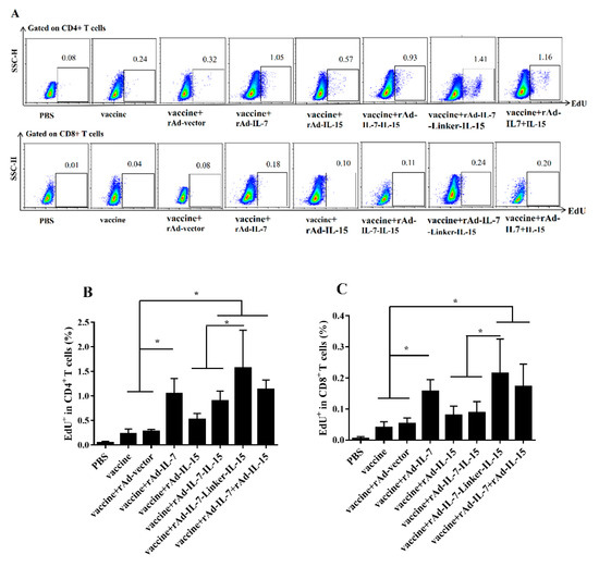 To evaluate proliferation of TCM like cells induced by different cytokines, at 20 weeks after the last immunization, we performed EdU proliferation assay [28]. For CD4+ T cells, the groups of vaccine + rAd-IL-7, vaccine + rAd-IL-7-IL-15, vaccine + rAd-IL-7-Linker-IL-15 and vaccine + rAd-IL-7 + rAd-IL-15 showed an enhanced incorporation compared with the control groups of vaccine and vaccine + rAd-vector; The frequency of EdU+ T cells in the vaccine + rAd-IL-7-Linker-IL-15 group was highest, which was obviously higher than that of the vaccine + rAd-IL-15 group and vaccine + rAd-IL-7-IL-15; There was no significant difference among the groups of vaccine + rAd-IL-15, vaccine and vaccine + rAd-vector (Figure 4A,B). For CD8+ T cells, the tendency was consistent with CD4+ T cells, the groups of vaccine + rAd-IL-7, vaccine + rAd-IL-7-Linker-IL-15 and vaccine + rAd-IL-7 + rAd-IL-15 promoted the frequency of CD8+ T cells incorporated with EdU compares with that of the vaccine and vaccine + rAd-vector control groups (Figure 4A,C). In conclusion, the vaccine + rAd-IL-7-Linker-IL-15 group induced the strongest capability of proliferation on CD4+ T cells and CD8+ T cells among these groups. The group of the vaccine + rAd-IL-7 showed stronger capability of proliferation on CD4+ T cells and CD8+ T cells than the control groups of vaccine and vaccine + rAd-vector. The group of the vaccine + rAd-IL-15 showed no obvious difference compared with the control groups of vaccine and vaccine + rAd-vector.