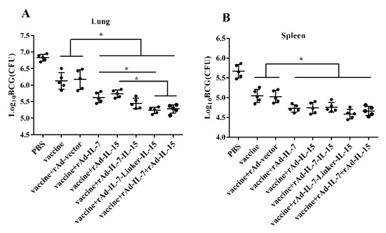 The protective efficacy of vaccines against BCG infection in mice. At 24 weeks after the last vaccination, mice were challenged with Mycobacterium bovis BCG 1 × 107 CFU/100 μL/mice by nasal. 3 weeks post-challenge, (A) mice were euthanized and the bacterial burden (CFU) was measured in lungs; (B) mice were euthanized and the bacterial burden (CFU) was measured in spleens. Data are presented as log10 CFU ± SD from groups of 5 mice. * p < 0.05.