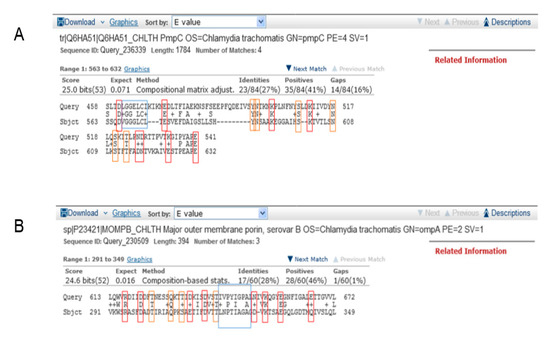 Amino acid sequence homology of the short peptide sequences of chlamydial proteins PmpC and MOMP-B with the tetanus toxin (TeNT). The parameters on the BLASTp network server were automatically set. The maximum overlaps of the TeNT amino acid sequence (Sbjct) and amino acid sequences of (A) PmpC and (B) MOMP-B (Query) are shown. The polar-charged amino acids are marked in red, the polar-uncharged amino acids are marked in orange, and the hydrophobic amino acids are marked in blue.
