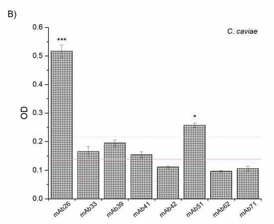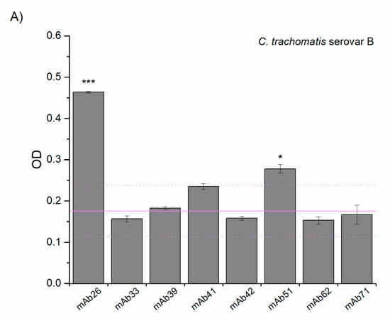 Reactivity of tetanus-specific monoclonal antibodies (mAbs) with C. trachomatis serovar B (A) and C. caviae (B). Threshold binding was determined with respect to mAbs other than mAb26 and mAb51 and presented as a mean +2SD (light magenta solid/doted lines). All samples were assessed in triplicate and results presented as a mean ± S.E; * p < 0.05, *** p < 0.001 compared to the threshold binding.