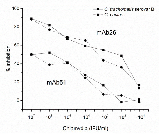The capacity of chlamydial elementary bodies (EBs; C. trachomatis serovar B and C. caviae) to inhibit the binding of mAb26 and mAb51 to TTd. The results represent the percentage inhibition of mAb26 and mAb51 binding to TTd with chlamydial EBs: C. trachomatis serovar B and C. caviae (both: 1 × 107–1 × 101 IFU/mL). The percentage (%) of inhibition was calculated from recorded optical density (OD) values, taking the one recorded in wells with mAbs alone as a 100% binding.