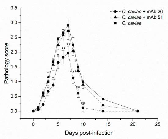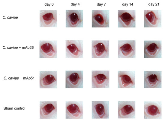 Representative photographs of guinea pigs’ conjunctiva at defined intervals (day 0, 4, 7, 14, and 21). The guinea pigs were infected with 1 × 104 IFU of C. caviae and 1 × 104 IFU of C. caviae preincubated with either mAb26 or mAb51 (10 μg/mL, 1 h/RT). Upon infection, the local treatment with corresponding mAb was performed daily until day 7 post-infection.
