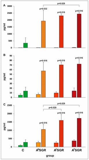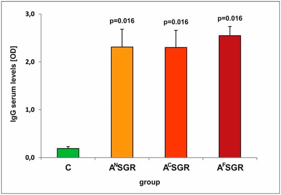 Reactivity of specific IgG antibodies present in sera from control (C: n = 5) and immunized (ANSGR, ACSGR, AFSGR: n = 4) mice with TLA. p values are provided above the bars to indicate significant differences in reactivity between immunized mice and control mice (C).