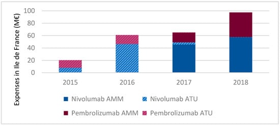 The financial mass committed in Ile-de-France for the treatment by immunotherapy of lung cancer amounts to tens of millions of euros, which weighs on health facilities. Anticancer drugs represent an increasingly important expense item. Thus, the INCa (French National Cancer Institute) estimated that in 2014, 55.7% of the total 2.87 billion euros of expenditure was dedicated to anticancer drugs [12]. Based on data from the ATIH (Technical Agency for Information on Hospital Care), we estimated the expenditure related to nivolumab and pembrolizumab at around 100 million euros in 2018 in Ile-de-France, all indications combined, private and public healthcare facilities combined, and regardless of the administrative status of the ICI (temporary authorization for use = ATU or regulatory approval by the French Health Agency or European Health Agency = AMM). As the time required to obtain the regulatory approval (AMM) is generally long, there is a temporary authorization for use (ATU) system in France. As long as the efficacy and the safety have been established by clinical studies, this system lets a potentially innovative drug in serious pathologies be available to patients more quickly, before obtaining AMM. This device exclusively concerns treatments for which the first trials have yielded very promising data. It is issued by the ANSM (French Agency for the Safety of Health Products) for drugs intended to treat serious or rare diseases for which there is no appropriate treatment or the implementation of the treatment cannot be postponed. Medicines under ATU are covered 100% by the French public health insurance.