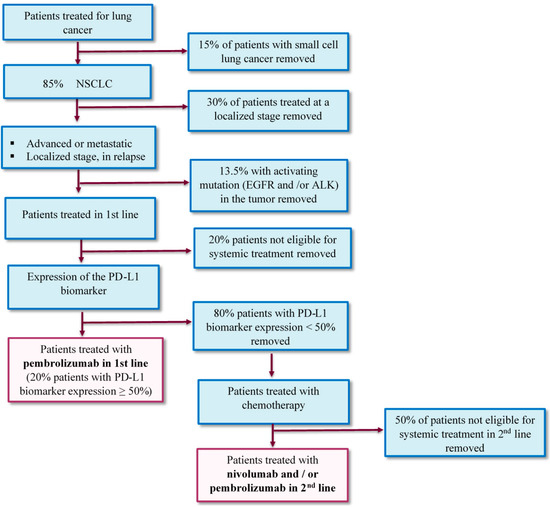 Among patients with NSCLC (85% of patients with lung cancer [27]), only those with advanced and/or metastatic stages are eligible, which represent, respectively, 30 and 40% of NSCLC. In addition, around 40% of patients with disease managed at the localized stage (surgery or radio-chemotherapy) will develop metastatic disease at distance. Therefore, 82% of patients will be likely to receive treatment at the metastatic stage. Without EGFR or ALK tumor mutations, found in about 13.5% of cases, systemic chemotherapy treatment is the standard: