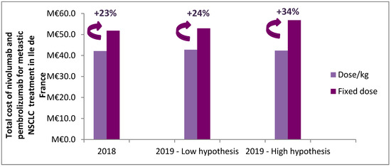It is in this context that a team from Avicenne Hospital wanted to measure the financial impact of the implementation of this new dose regimen in the treatment of lung cancer, by comparing the cost of prescribing nivolumab and pembrolizumab as a fixed dose compared to the cost of the treatment at the reference of weight-based dosing. The study was carried out first at our hospital level and then at the regional level of Ile de France. This study was conducted before the approval of ICI in combination to chemotherapy in the first line setting and before the result of atezolizumab in the second line setting of advanced NSCLC [19,20].