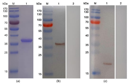 (a) SDS-PAGE analysis of the purification of recombinant TgH2A1. Line M: protein molecular weight marker; Line 1: rTgH2A1 purified by Ni2+ charged column chromatography and dialysis. (b) Western blotting of recombinant TgH2A1. Line M: protein molecular weight marker; Line 1: rTgH2A1 probed by serum from rats against T. gondii as the primary antibody; Line 2: rTgH2A1 probed by sera from normal rats as the primary antibody. (c) Western blotting of native TgH2A1. Line M: protein molecular weight marker; Line 1: total soluble protein of T. gondii tachyzoites probed by sera from rats immunized by rTgH2A1 as the primary antibody; Line 2: total soluble protein of T. gondii tachyzoites probed by sera of normal rats as the primary antibody.
