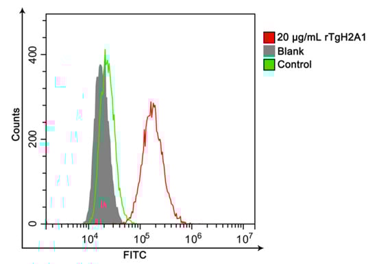Representative FACS histograms showed a shift in fluorescence intensity of murine Ana-1 cells combined with rTgH2A1 labeled with FITC. In the blank group and control group, the Ana-1 cells were treated with PBS and purified his-tagged protein, respectively, while the experimental group was treated with purified recombinant TgH2A1 (20 μg/mL). After incubation, the mouse antirat IgG labeled with FITC was added.