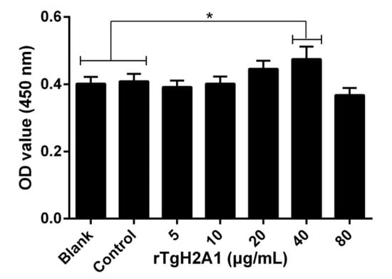 Effects on proliferation of different concentrations (0, 5, 10, 20, 40, and 80 μg/mL) of rTgH2A1 on the murine macrophages. The proliferation assay was performed using the CCK-8 reagent kit. The cell proliferation index was calculated using the OD450 values. The Ana-1 cells in the blank groups were treated with PBS while those in the control group were treated with his-tagged protein. Results were evaluated using one-way ANOVA analysis followed by Dunnett’s test and expressed as mean ± standard deviation of three independent experiments. * p < 0.05 compared with the blank or control group.