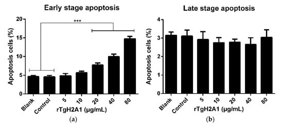 Treated with CCK-8 reagent, the cell proliferation capacity was conducted to confirm the effects of rTgH2A1. The OD450 showed that no significant difference was observed between the blank group preincubated with PBS and the control group preincubated with his-tagged protein, and the proliferation of Ana-1 cells incubated with rTgH2A1 at the concentration of 40 μg/mL was significantly promoted compared with the blank and control groups (p < 0.05, Figure 3). The results expressed as mean ± standard deviation including p values are shown in Table S1. The amount of early- and late-stage apoptotic cells was subsequently detected using an Annexin V-FITC kit. The results showed that early-stage apoptosis was promoted by coculturing with rTgH2A1 at concentrations of 20, 40, and 80 μg/mL (p < 0.001, Figure 4a).