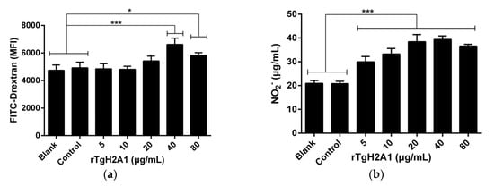 Ana-1 cells were exposed to different concentrations of rTgH2A1 (0, 5, 10, 20, 40, and 80 μg/mL) for 48 h, and the ability of murine Ana-1 cells to engulf FITC-dextran was significantly promoted by coculturing with rTgH2A1 at the concentration of 40 μg/mL (p < 0.001) and 80 μg/mL (p < 0.05), compared to the blank and control groups (Figure 5a). After treatment with rTgH2A1, NO production was significantly stimulated in supernatants of Ana-1 macrophages at all concentrations (5, 10, 20, 40, and 80 μg/mL) of rTgH2A1 compared with the blank and control groups (p < 0.001, Figure 5b).
