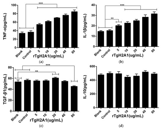 rTgH2A1 induced cytokine secretion of the murine macrophages in vitro. Preincubated with different concentrations (0, 5, 10, 20, 40, and 80 μg/mL) of rTgH2A1 for 48 h, cytokine secretion was determined by commercial kits based on the double antibody sandwich method. The Ana-1 cells in the blank groups were treated with PBS while the control group was treated with his-tagged protein. Results were evaluated using one-way ANOVA analysis followed by Dunnett’s test, and values were displayed as mean ± standard deviation from three independent experiments. ** p < 0.01, and *** p < 0.001 compared with the blank group or control group. Effect of rTgH2A1 on the TNF-α (a), IL-1β (b), TGF-β1 (c), and IL-10 (d) secretion of murine Ana-1 cells was determined.