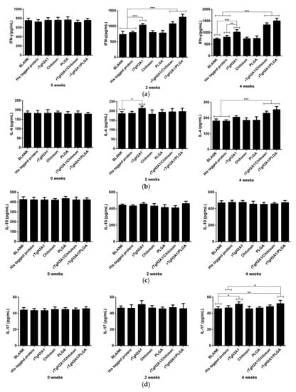 The sera separated from each mouse in a different group at weeks 0, 2, and 4 were used to obtain the levels of IFN-γ, IL-4, IL-10, and IL-17, according to the manufacturer’s instructions from commercial kits based on the double antibody sandwich method. As shown in Figure 8a, higher levels (p < 0.001) of IFN-γ were detected in groups immunized with rTgH2A1/chitosan and rTgH2A1/PLGA compared with the blank and his-tagged protein groups at weeks 2 and 4. The mice immunized with rTgH2A1 could generate significantly higher IFN-γ compared with the blank group in weeks 2 and 4 (p < 0.001) and the his-tagged protein group in weeks 2 (p < 0.001) and 4 (p < 0.01). As shown in Figure 8b, mice immunized with rTgH2A1/chitosan and rTgH2A1/PLGA showed a significant level of IL-4 compared with the blank and his-tagged protein groups (p < 0.001) in week 4, while the mice immunized with rTgH2A1 produced a higher level in week 2 (p < 0.05). Mice immunized with rTgH2A1/PLGA could generate a significantly higher level of IL-17, compared with the blank (p < 0.01) and his-tagged protein groups (p < 0.05) in week 4 (Figure 8d). Additionally, in week 4, mice immunized with rTgH2A1 alone could secrete a higher level of IL-17 compared with the blank group (p < 0.05, Figure 8d). However, there were no significant changes observed in the levels of IL-10 secreted by mice among different groups (Figure 8c).