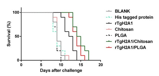 To analyze whether the two types of nanoparticles could confer effective protection against acute toxoplasmosis, each immunized mouse was injected with 200 tachyzoites of the virulent RH strain 2 weeks after the last immunization. As illustrated in Figure 9, all mice vaccinated with PBS, his-tagged protein, PLGA, and chitosan succumbed within 12 days of infection. Compared to the blank (9.300 ± 0.900 days) and his-tagged group (9.100 ± 1.135 days), a significant prolonged survival time (p < 0.001) in mice vaccinated with rTgH2A1 (12.200 ± 1.326 days), rTgH2A1/chitosan (14.700 ± 1.86 days), and rTgH2A1/PLGA (13.900 ± 1.135 days) was observed. Moreover, animals vaccinated with rTgH2A1/chitosan showed a significant increase (p < 0.001) in their survival time with a maximum survival time of 17 days.