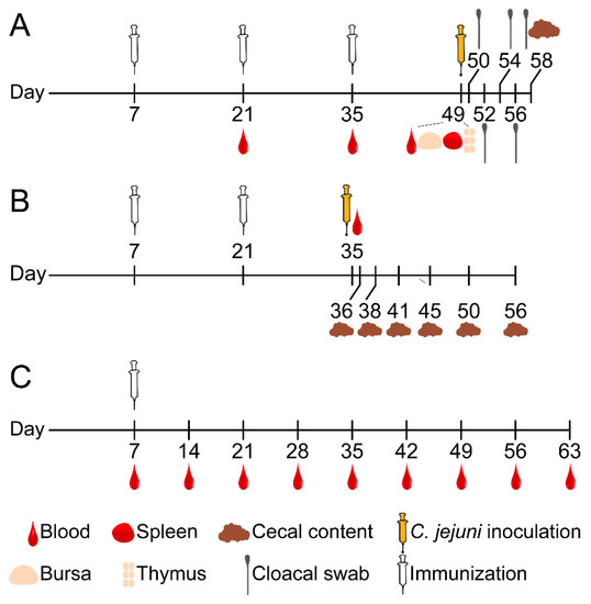In Trial A, 50 SPF chickens (25 chickens per group) were used to evaluate the effects of immunization of chickens with the Ent–KLH vaccine for three times on growth performance, Ent-specific immune response and protection against C. jejuni colonization (Figure 1A). Chickens received three immunizations at age of 7, 21 and 35 days, respectively. Blood samples were collected 14 days after each immunization and the sera were separated for detection of Ent-specific antibody. Each chicken was weighted weekly. Nine chickens of each group were euthanized at 49 days old; major immune organs (bursa, spleen and thymus) and cecal contents were collected from each chicken as well. The development of each immune organ was determined according to the percentage of each immune organs (bursa, spleen or thymus) weight to its body weight at 49 days old. Cecal content from each euthanized chicken was immediately frozen in liquid nitrogen for microbiota analysis described below. The remaining 16 chickens in each group were orally challenged with C. jejuni (104 CFU per chicken) at age of 49 days old. Cloacal swabs were collected from each chicken on Days 1, 3, 5, 7 and 9 post inoculation. On Day 9 post inoculation, all chickens were euthanized and cecal contents were collected. Both cloacal swabs and cecal samples were subjected to 10-fold serial dilutions and plated on MH agar plates containing Campylobacter-specific selective supplements (SR117E, Oxoid, Bashingstoke, Hampshire, England) for enumeration of C. jejuni as described previously [18].