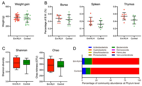 Effects of vaccination of chickens with the Ent–KLH conjugate on growth performance, immune organ development, and gut microbiota. (A) Chicken body weight gain. Each symbol represents the body weight gain of each individual chicken between ages of 7 and 49 days. (B) The weight percentage of each immune organ (bursa, spleen or thymus) to its body weight at 49 days old. (C) The Shannon diversity and the Chao richness (OTU) based on 16S rDNA amplicon sequences of the cecal samples. (D) Relative abundance of the eight dominant phyla in the cecum between Ent–KLH and PBS-control groups.