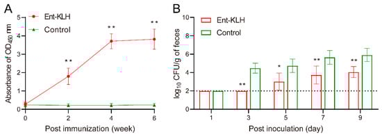 3.2. The Ent–KLH Conjugate Vaccine Significantly Elicited Ent-Specific Antibody Response (Trial A)