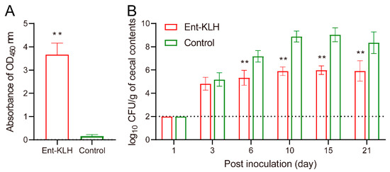 Quantitative measurement of C. jejuni in cecal contents at different time points post inoculation (Figure 4B) confirmed the protective efficacy of the Ent–KLH vaccine observed in Trial A (Figure 3B): the C. jejuni level in the chickens immunized with the Ent–KLH was significantly (p < 0.01) lower than that in control group (up to 3.20 log10 units) from six days post inoculation (Figure 4B). Notably, at 21 days post inoculation, the C. jejuni colonization level in the cecum of the chickens receiving the conjugate vaccine was still more than 2 log10 units lower than that in control group (Figure 4B).