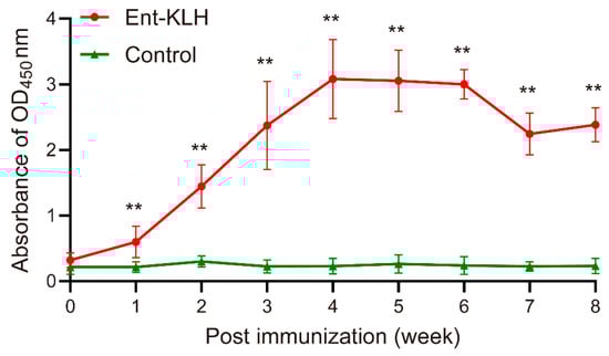 Persistence of Ent-specific IgG upon single vaccination of chickens with the Ent–KLH conjugate vaccine (Trial C). Each point represents the average of OD450 absorbance from 20 individual serum samples (200-fold dilution) with standard deviation indicated by error bar. ** p < 0.01.