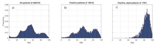 In Figure 2, we show the results obtained for the age distribution of the whole population and in the subsets of COVID-19 positive and dead patients. Superimposed to the empirical distributions, we also plot the G-KDE. In Figure 2a,b, we observe three peaks. They reflect the demographic profile in Italy, schematically associated to the three main age groups of 0–30, 30–70, and 70–100 years. In fact, 30 is approximately the location of the local minimum between the first and second peaks, while 70 is the same for the second and third peaks. Figure 2b relative to positive patients, shows a statistically significantly different pattern from that in Figure 2a (KS-test: p-value < 10−3). The relative weights of the three peaks changed, in favor of the oldest ages. We also found statistically significant differences when comparing the positive patients (Figure 2b) to the dead ones (Figure 2c) (KS-test: p-value < 10−3).