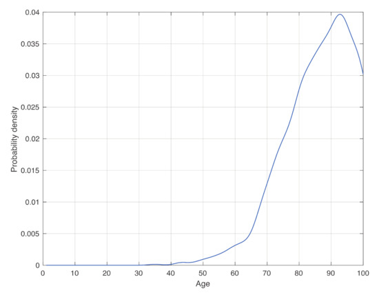 This kind of problem is known as the linear programming problem [26], which can be solved by the simplex method [27]. When applying the proposed methodology to our dataset, the product corresponds to the empirical histogram in Figure 2c. Intuitively, to minimize , small values of should be associated to large values of . Here, this product has a peak around 85 years (see Figure 2c), and therefore, around that peak, we should choose small values of the weights , which corresponds to a high frequency of vaccination. Instead, in a general condition, one can use the estimate of shown in Figure 3, while the other two factors should be estimated from data in the specific context considered. Sharp upper and lower bounds for can also be introduced.
