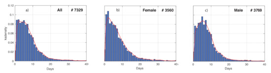 In Figure 4, we show the distribution of the time between first symptoms onset and first positive test, denoted by tSP. This can be very useful when adopting informative models to describe the evolution of the COVID-19 epidemic, such as the compartment ones. In fact, this kind of models contains one parameter for the transition rate between the compartment of infected patients developing symptoms, and the one of COVID-19 diagnosis. The reciprocal of the transition rate is proportional to tSP; therefore, its distribution can be used in a Bayesian framework as a prior density [13]. The influence of the gender on this distribution was investigated. Based on the empirical distribution, G-KDE was performed to fit the data. The means obtained for the females are shorter than for males. More interestingly, the shape of the two empirical distributions looks different to each other. This difference is statistically significant, in fact the KS-test resulted in a p-value < 10−3. A further investigation is needed to study the influence of social and biological factors on these results.