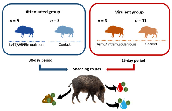 Schematic illustration of trial schedule and experimental groups. The attenuated group consisted of 12 animals (nine orally inoculated and three contacts). The virulent group consisted of 17 animals (six intramuscularly inoculated with Arm07 strain and 11 contacts). Three different shedding routes were evaluated (blood, oral fluid, and feces) in all the animals from both groups.