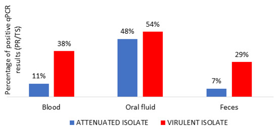 A total of 592 individual paired samples of blood, oral fluid, and feces were analyzed, 361 from the attenuated group and 231 from virulent group. All the inoculated and in-contact animals were successfully infected in both independent experiments. The route of virus administration did not influence the Ct values obtained for the qPCR of the inoculated (orally or intramuscularly) and in-contact animals in either group (Mann–Whitney U test, p < 0.05).