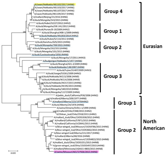 Phylogenetic tree of H4 hemagglutinin (HA) genes of influenza viruses. The nucleotide sequence of the HA gene segment was analyzed by neighbor joining using MEGA 7.0. The number on each node indicates the confidence level of the bootstrap analysis with 1000 replications. The Eurasian lineage was classified into Groups 1–4, and the North American lineage was classified into Groups 1 and 2. The vaccine strain is highlighted in yellow, and the challenging virus is highlighted in pink. The reference viruses used in the antigenic analysis are underlined in blue.