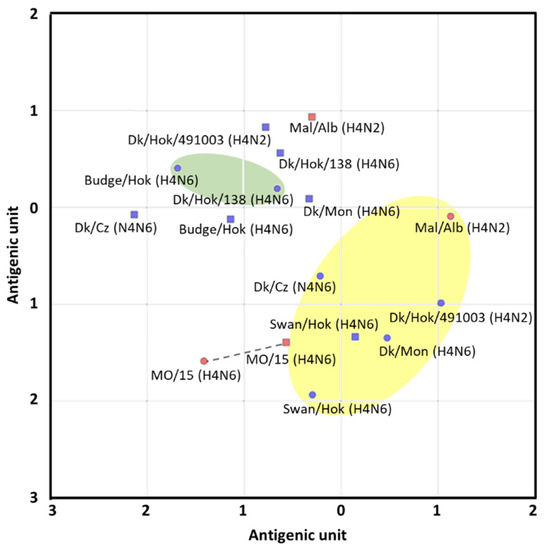 Antigenic cartography based on the cross-HI test of the viruses and antisera of different lineages. In antigenic cartography, vertical and horizontal axes show the distance of the antigen. Dots with round and square shapes indicate antigens and antibodies, respectively. The distance between two dots on the map represents the antigenic distance. Blue and red dots indicate the isolates belonging to the Eurasian and North American lineages, respectively. The antigenic group is shown in yellow or green. The dotted line represents homologous combination. The spacing between grid lines is equivalent to an antigenic unit distance corresponding to a two-fold HI difference.