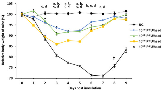 Changes in the body weight of mice inoculated with various doses of MO/15 influenza virus. The pathogenicity of dose-dependent viral titers was compared. Body weight was monitored for 9 days after challenge with different doses (103.0, 104.0, 105.0, or 105.9 plaque-forming units (PFU)/30 µL) of MO/15 (n = 4 mice/group). †, euthanasia. a, significant difference between NC and 103.0 PFU/head (p < 0.05); b, significant difference between negative control (NC) and 104.0 PFU/head (p < 0.05); c, significant difference between NC and 105.0 PFU/head (p < 0.05); d, significant difference between NC and 105.9 PFU/head (p < 0.05).