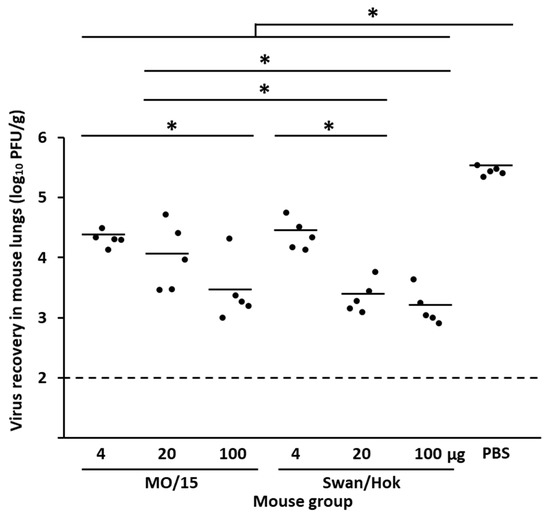 Virus recovery in the lungs of mice subcutaneously vaccinated twice with various amounts of the MO/15 or Swan/Hok vaccine after a challenge with 105.9 PFU/30 µL MO/15. Viral titers were measured on day 3 after the MO/15 challenge. * p < 0.05.