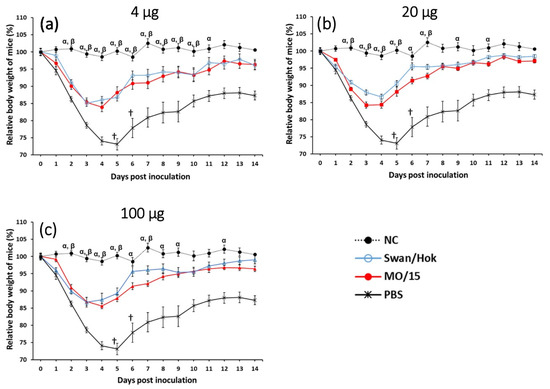 Changes in the body weights of mice subcutaneously vaccinated twice with Swan/Hok and homologous MO/15 after a challenge with MO/15 influenza virus. Body weights were monitored for 14 days after the MO/15 challenge (n = 5 mice/group). Mice received two immunizations: 4 µg (a), 20 µg (b), or 100 µg (c) of each vaccine subcutaneously. †, euthanasia. α, significant difference between NC and MO/15 (p < 0.05); β, significant difference between NC and Swan/Hok (p < 0.05).