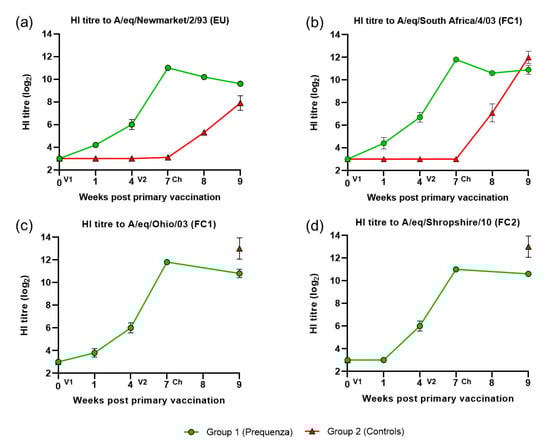 - Anonymous. Equine influenza vaccine (inactivated) monograph 0249, 2-3-2-2-2. Haemagglutinin-inhibition test. In European Pharmacopoeia, 9th ed.; Directorate for the Quality of Medicines & HealthCare of the Council of Europe (EDQM): Strasbourg, France, 2017; p. 1052. [Google Scholar]